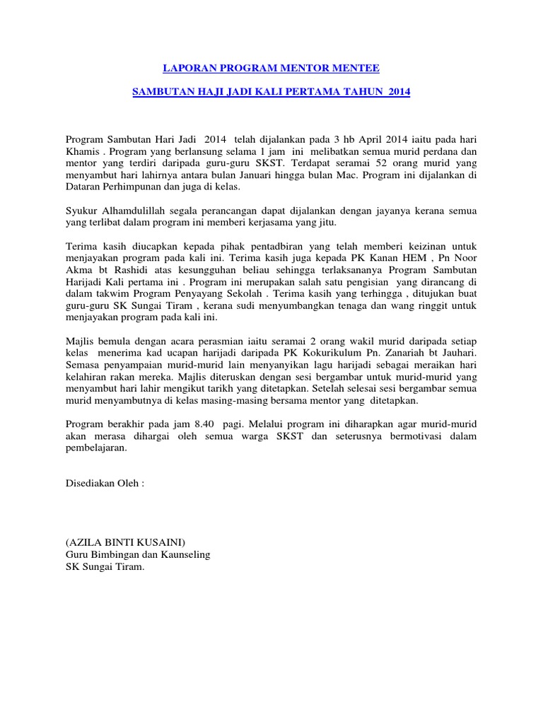 Setiap mentor diberikan senarai tugas peranan modul dan senarai mentee. Mentor Mentee 2015 Doc Document. Laporan Program Mentor Mentee.